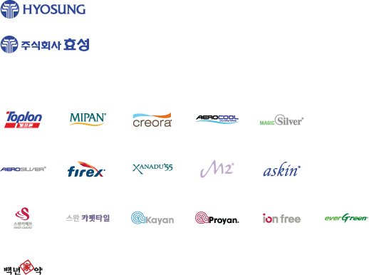 •섬유 - 토프론, 마이판, 크레오라, 에어로쿨, 매직실버, 에어로실버, 파이렉스, 제나두-55, 엠투, 아스킨